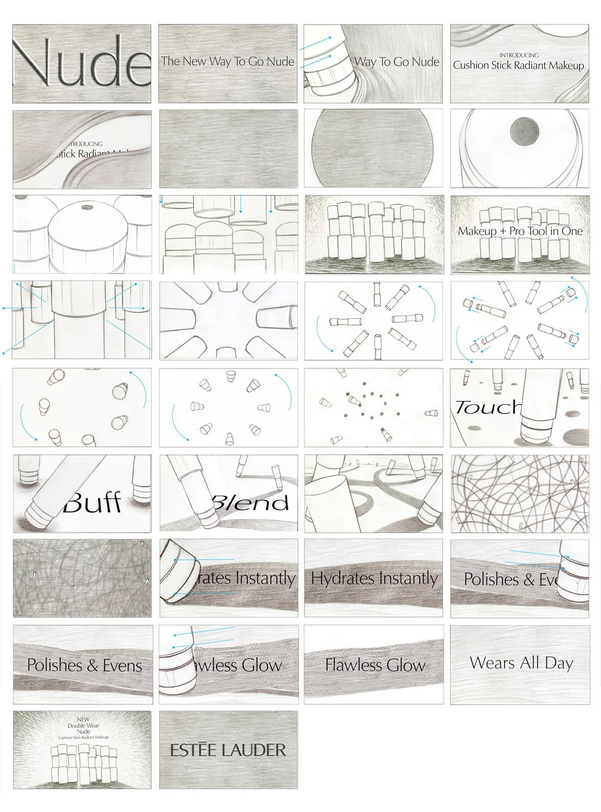 Design and storyboard illustrations of a 3D motion graphic video for Estée Lauder, introducing thenew Cushion Stick Radiant Makeup. 3D Animation by Sanders Hernandez.